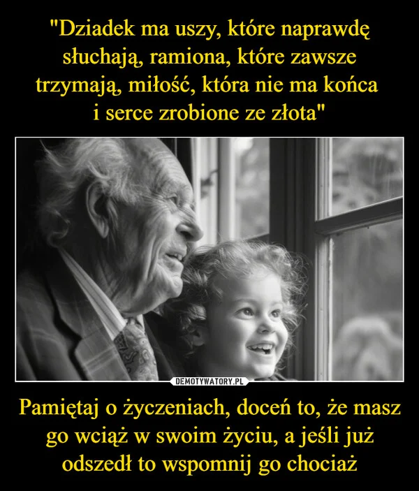 "Dziadek ma uszy, które naprawdę słuchają, ramiona, które zawsze trzymają, miłość, która nie ma końca i serce zrobione ze złota" Pamiętaj o życzeniach, doceń to, że masz go wciąż w swoim życiu, a jeśli już odszedł to wspomnij go chociaż
