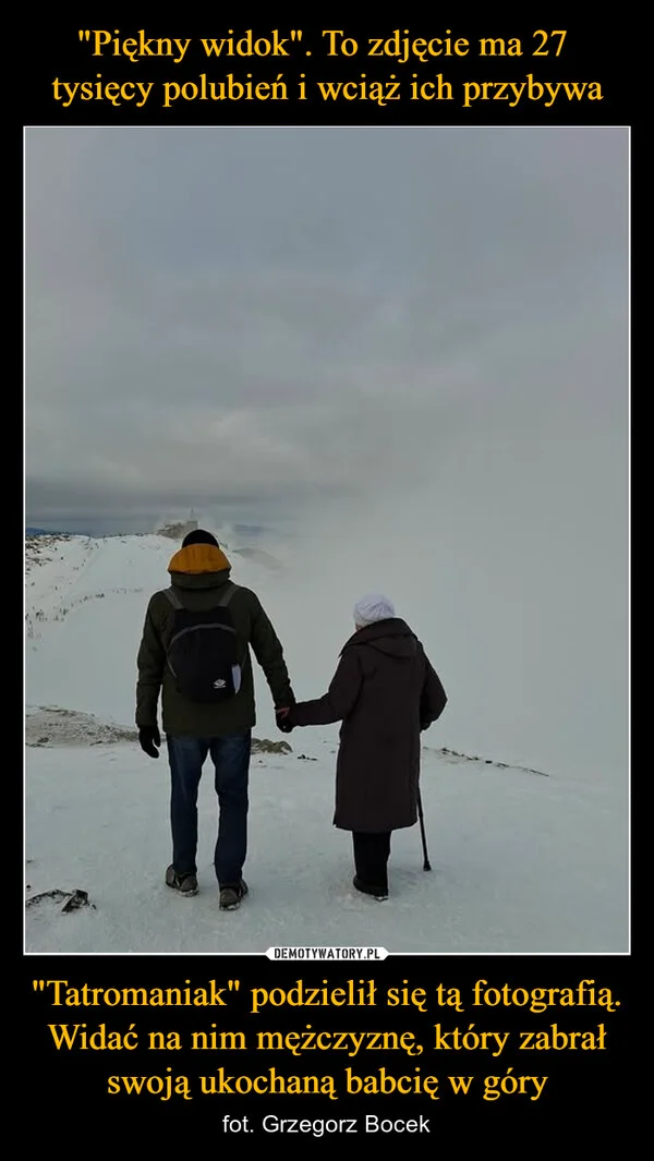"Piękny widok". To zdjęcie ma 27 tysięcy polubień i wciąż ich przybywa "Tatromaniak" podzielił się tą fotografią. Widać na nim mężczyznę, który zabrał swoją ukochaną babcię w góry
